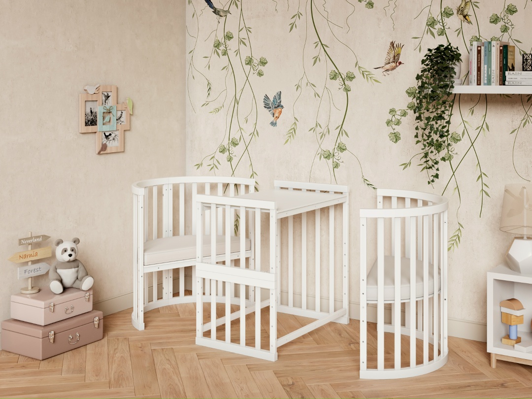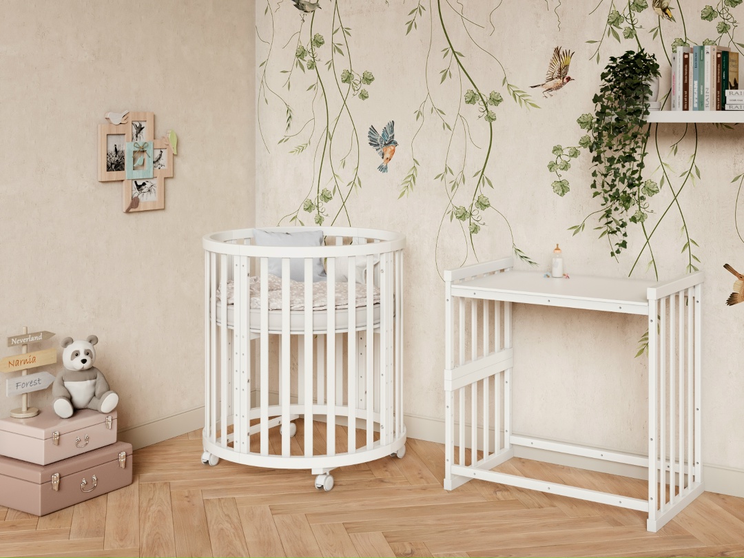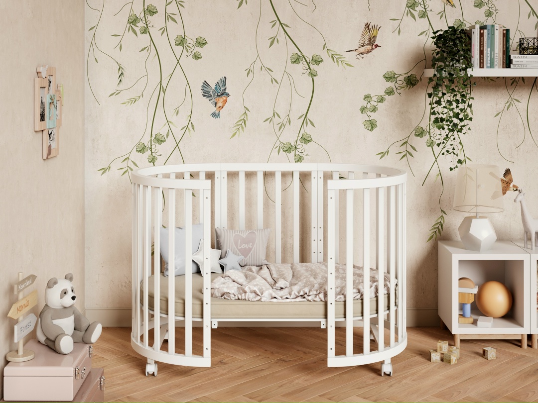 Благодаря круглой форме, колесикам и легкой, но прочной древесине, из которой сделана кроватка мама может делать перестановки мебели хоть каждый день. Такая модель считается наиболее безопасной - у нее отсутствуют острые углы, что сводит к минимуму риск травм. Форма кроватки способствует более быстрому развитию ребенка, так как в ней открывается обзор на 360 градусов. По мере того, как растет малыш, вместе с ним растет и кроватка!