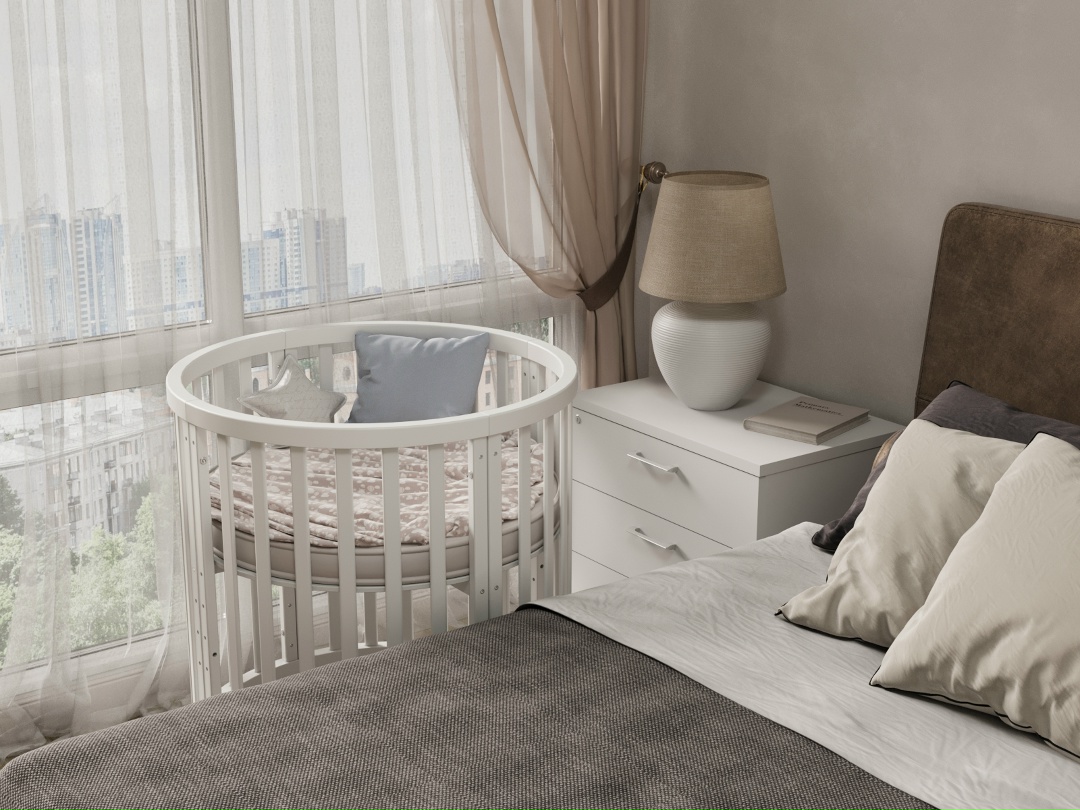 - Круглая люлька размером 75*75 см с широкими рейками на безопасном расстоянии, от рождения до 6 месяцев.